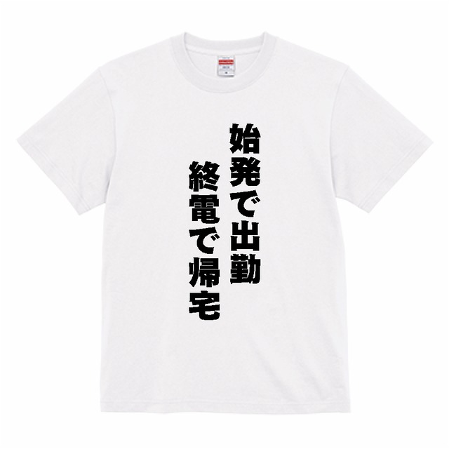 「始発で出勤 終電で帰宅」(UD丸ゴ_ラージ U)文字Tシャツ おもしろ ネタデザイン 半袖 メンズ 言葉 ★Tシャツカラー:ホワイト★【受注生産・メーカー直送品】